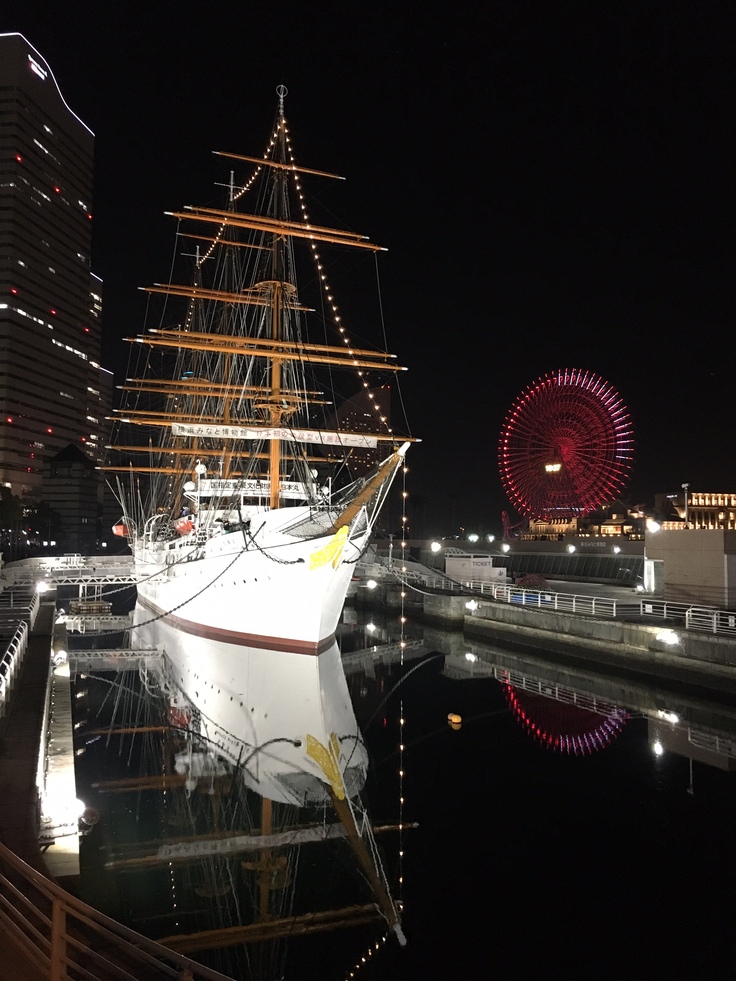 夜景が美しい季節になりました。帆船日本丸もとてもきれいです。ドックの水面に船体とマスト、ヤードが映っています。横浜・みなとみらいにおいでの際は、ぜひ帆船日本丸の夜景もお楽しみください。