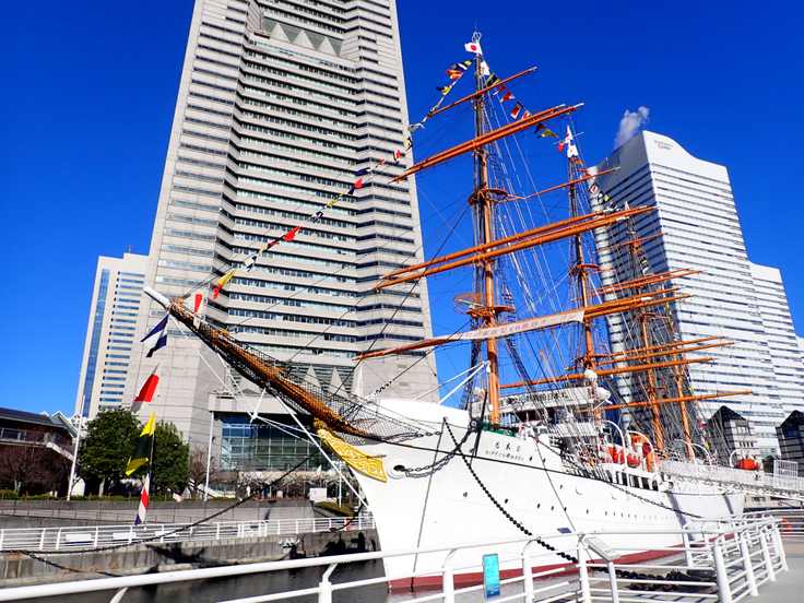 日本丸では船首から各マストの頂きを経て船尾まで、国際信号旗を綴っています。