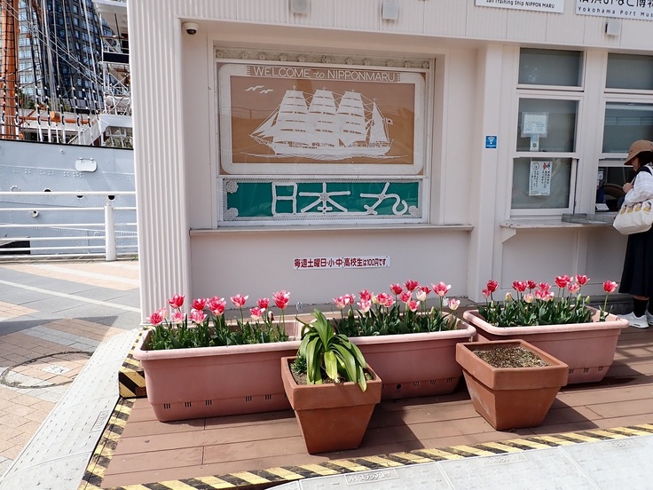 帆船日本丸の乗下船口では「ラバーズタウン」というチューリップが咲いています。