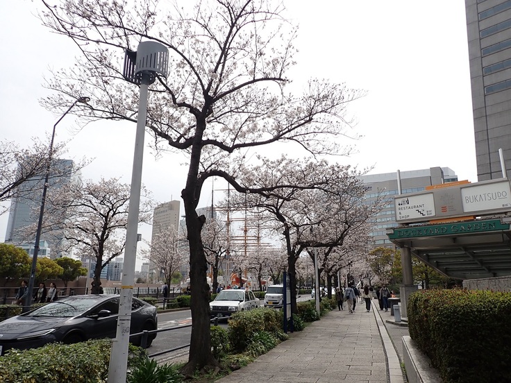 帆船日本丸右舷側のさくら通りの桜が咲いてきました!とてもきれいです。
