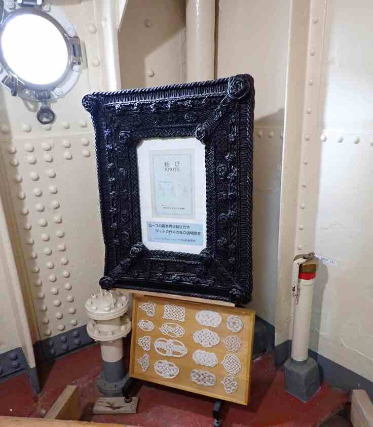 日本丸の船内には、たくさんのロープ飾りが展示されています。