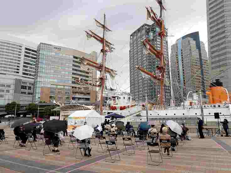 帆を広げる作業中には、展帆作業の説明があります。雨の中ですが、熱心に説明を聞く方が多数おられました。