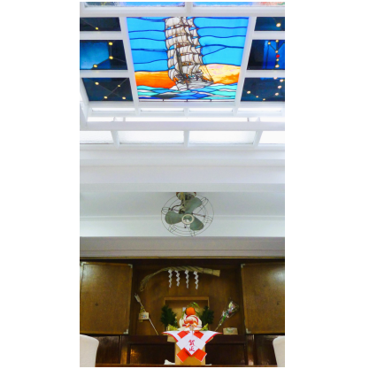 天井にはステンドグラスの展示もありますので、室内の細部までぜひご注目ください。