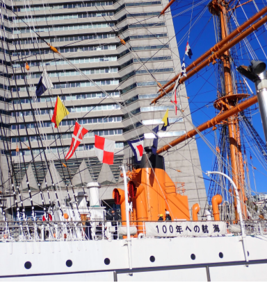 日本丸では船首から各マストの頂きを経て船尾まで、国際信号旗を綴っています。