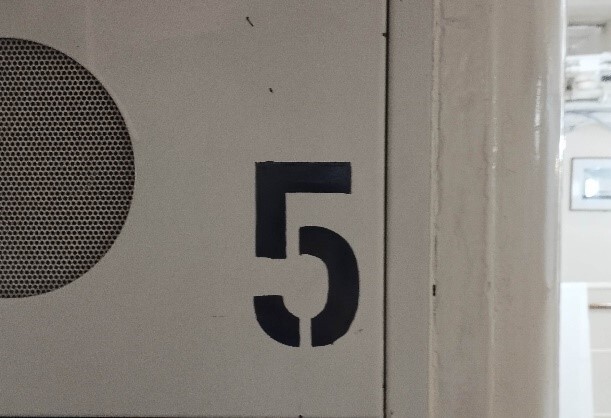 さて、こちらの写真の「5」の数字ですが、実は船内の消火栓扉に書かれている数字です。