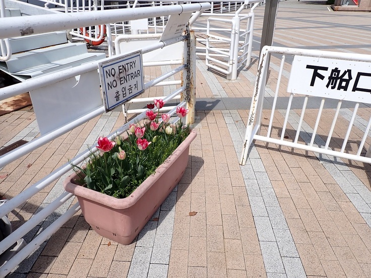 帆船日本丸の乗下船口では「ラバーズタウン」というチューリップが咲いています。