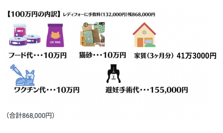 ◆ご支援の内訳◆ 家賃(3ヶ月分)41万3000円 フード代 ・・・10万円 猫砂・・・・・・10万円 ワクチン代・・・10万円 避妊手術代・・・15万5000円