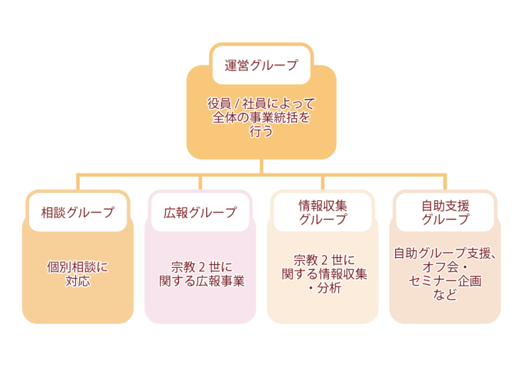 そして、以下のような組織体制のもと、多くの宗教2世の方々に支援が届けられるような広報・広告、宗教2世の方々の横のつながりを持っていただくための交流会や自助グループなどの活動も展開していきたいです。
