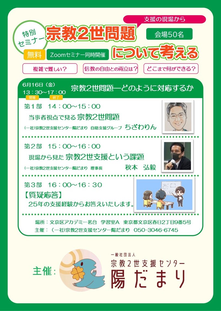 去る6月16日、東京都文京区にありますアカデミー茗台において、特別セミナー「支援の現場から宗教2世問題について考える」を開催しました。