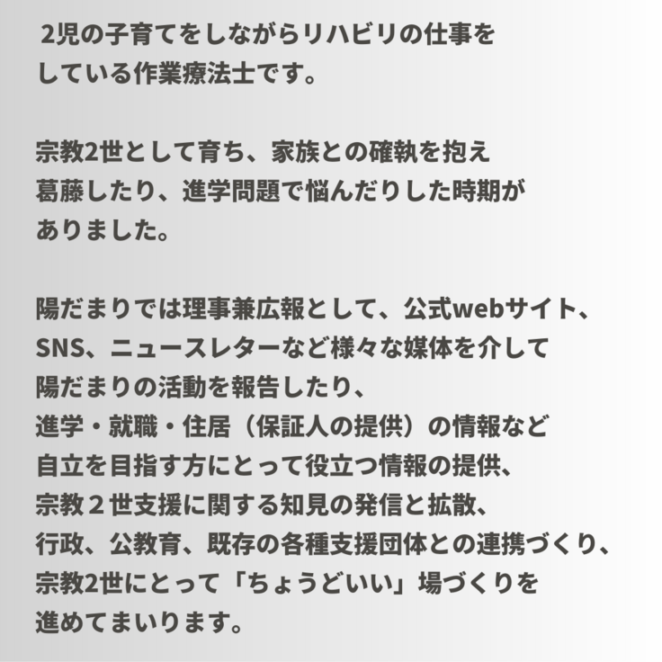 一人で悩んでいる宗教2世の方々が支援につながれるよう、団体の体制強化や居場所づくりを