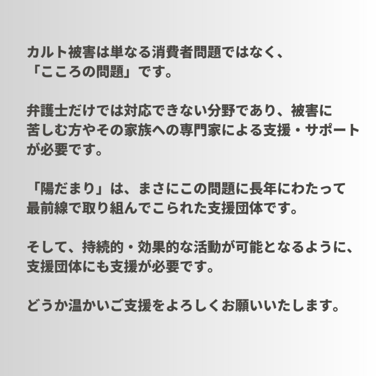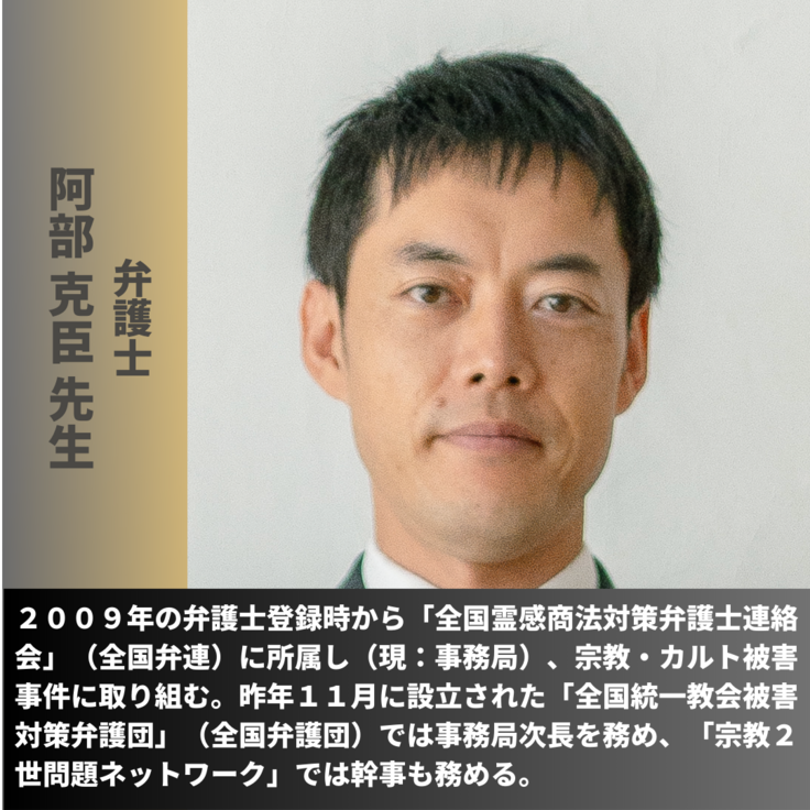 阿部先生は、現在REDY FORの今なお苦しみつづける被害者にご支援を|全国統一教会被害対策弁護団のプロジェクㇳを実行しておられます。応援しております!