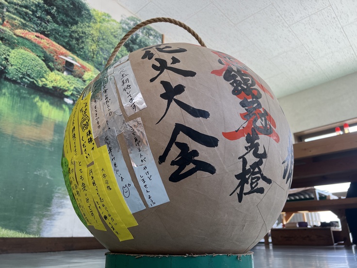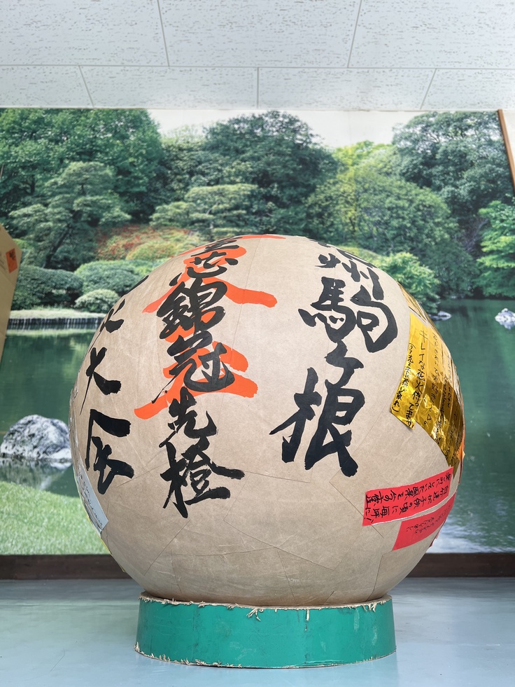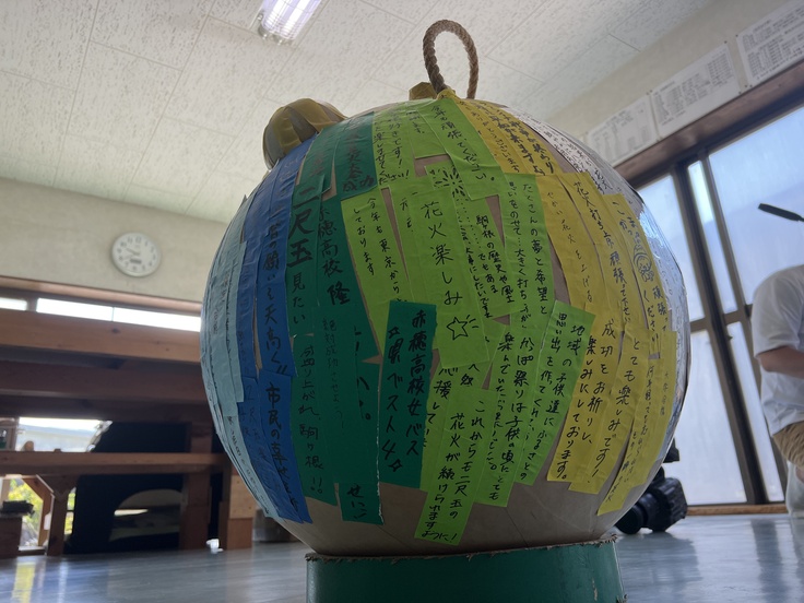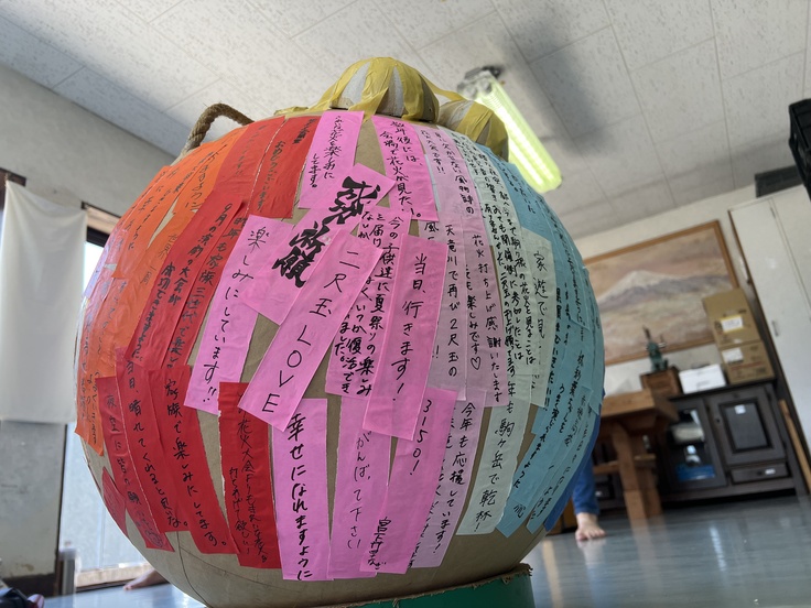 本日、二尺玉花火の玉に貼らさせて頂きました。