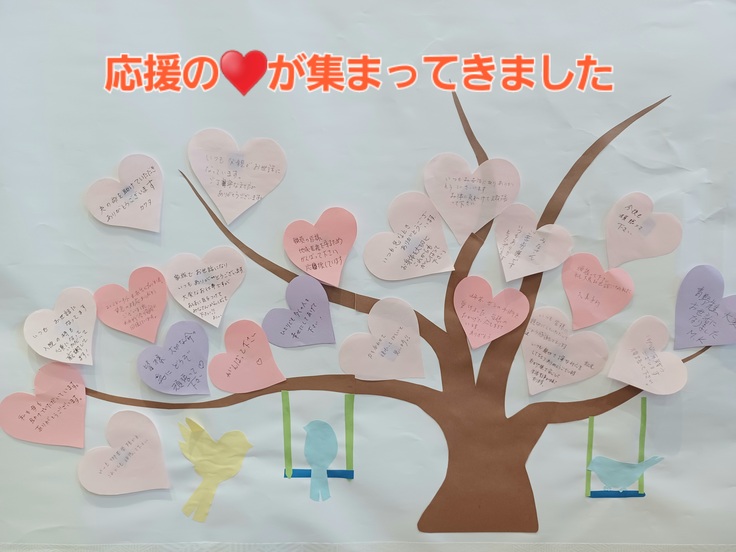 エントランスの木にも花びらが増えてきました!! 救急・災害だけではなく、医師・病棟スタッフ・病院職員へ向けての応援メッセージです。本当に皆様のお言葉が励みになっております。