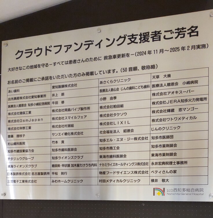 クラウドファンディングにご協力をいただいた皆様のお名前を記したご芳名板が完成し、多くの方にご覧いただくため、5月13日に正面玄関エントランスホールに設置し、また、当院のホームページにも掲載しましたのでご報告いたします。