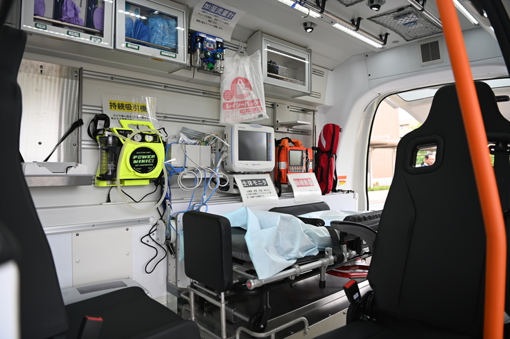 ドクターカーは天井が高く動きやすいようになっており、除細動器(AED)、生体情報モニターなどを搭載しています。