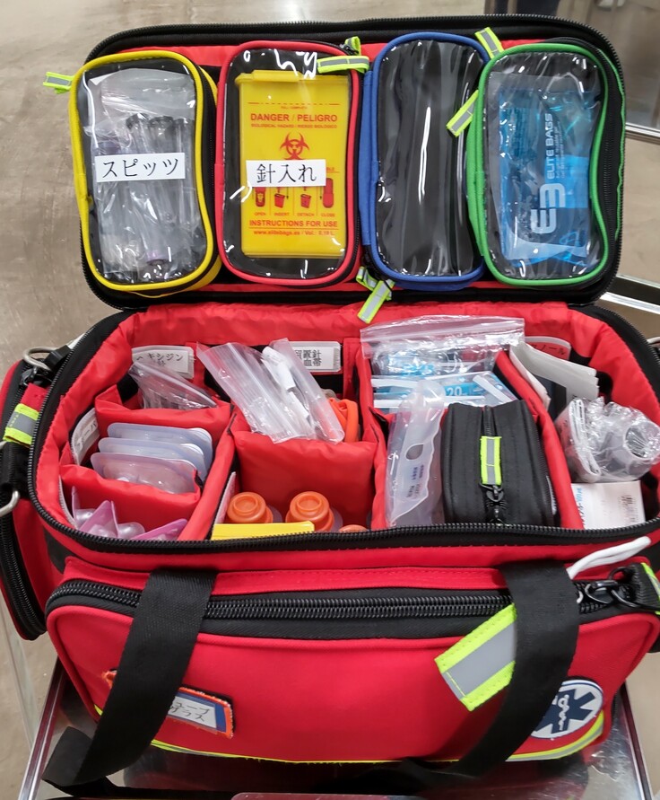 出動時には、処置で使用する診療材料をセットしたバックを持参します。