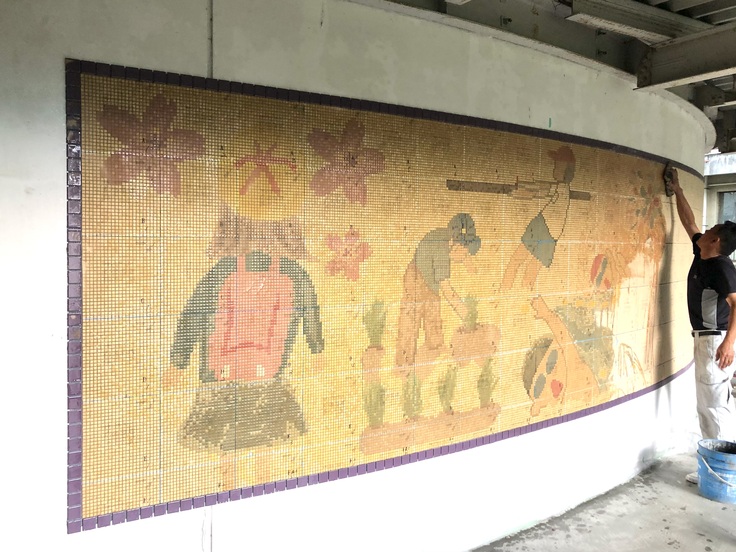 タイル壁画の設置作業が進んでいます。写真は本日8月1日(火)の様子です。表面の薄いシールを明日の朝に剥がし、目地を埋めて完成です。鮮やかなタイル壁画が姿を現すと思います。楽しみです。明日の作業の様子は地元のケーブルテレビが取材しますので、番組がホームページにアップされましたら、ご案内します。