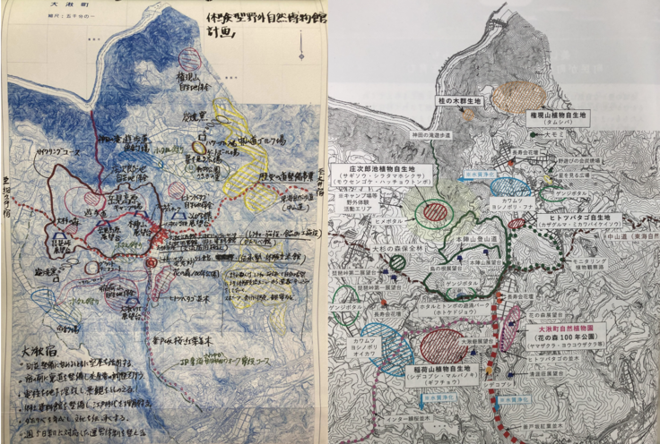 また、町中が自然博物館になるよう大事に守り育ててきた生態系があります。20年以上前から大湫町には「体験型野外自然博物館計画」があり、昨年、20年前の地図(左)から、更新されました(右)。