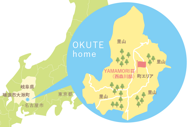 単純に建物を指すだけでなく、大湫町に住む人々や野山もOKUTE homeの大事な要素とし、OKUTE homeの中に、山も、森も、暮らしも、まるごと楽しめる拠点「YAMAMORI荘」をつくります。