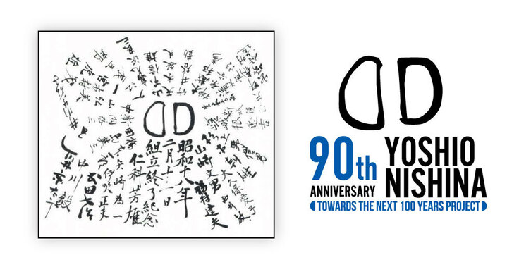 これは1943年に大サイクロトロンを組み上げた時に、当時の仁科研究室で書かれた寄せ書きをモチーフにしています。「ᗡD」は、大サイクロトロンの心臓部である加速電極を表しています。