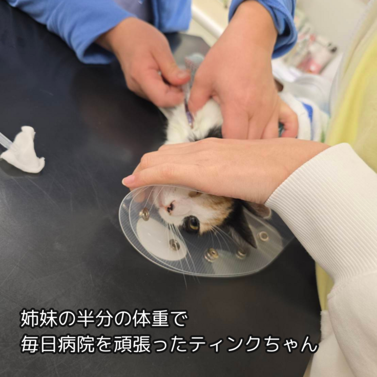 一緒に保護した姉妹のベルは体重3kgを超えていたのに、ティンクは1.5kgというガリガリの状態。毎日点滴をして、本当にいつ命が消えてしまってもおかしくありませんでした。