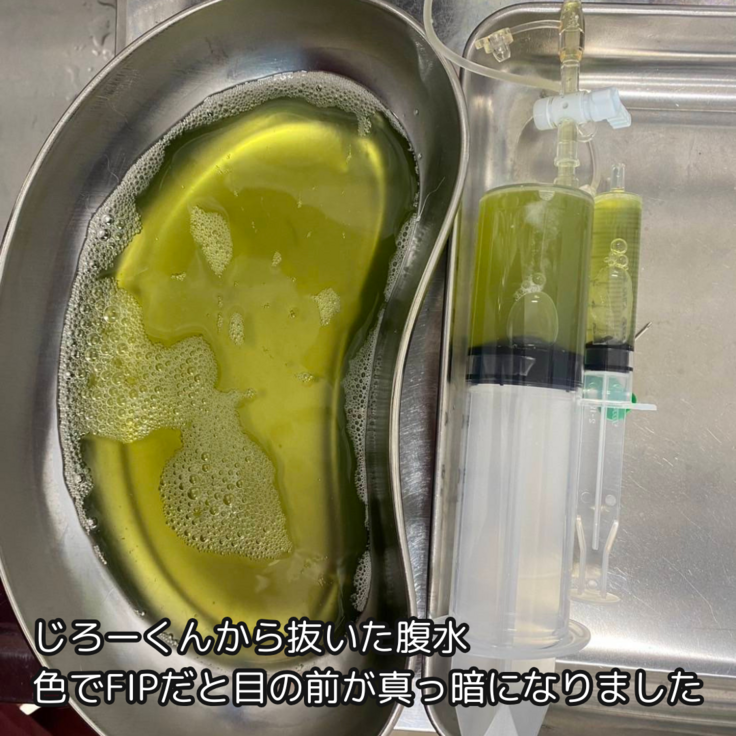 11日には40度の熱があり、腹水が溜まっており、腹水の色からFIPの疑いがかなり高いためそのまま緊急入院をし投薬治療を開始。