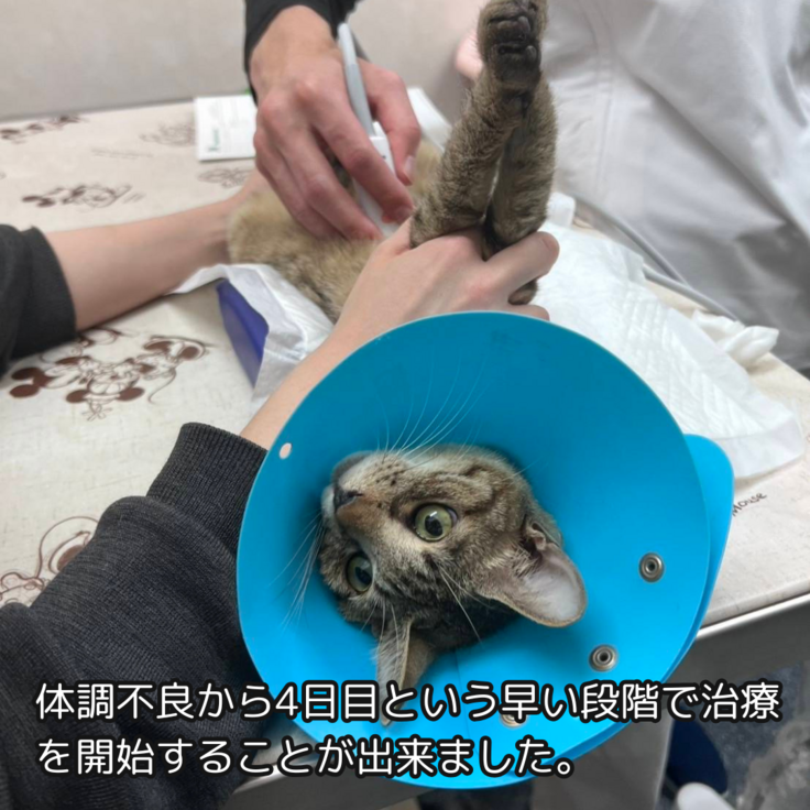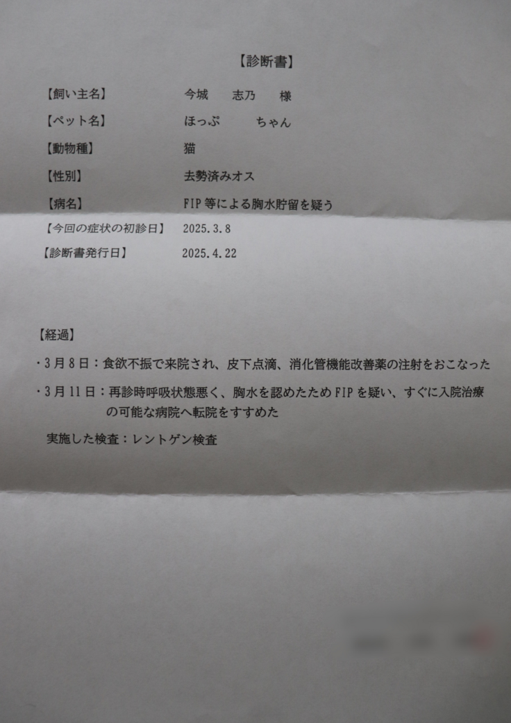 先天性の疾患かもしれないと診断されていましたが、最後にすがる思いでFIPに詳しい病院に行き検査をし、腹水は溜まっていませんでしたが、状態からしてFIPの疑いが強いとのことで即日に緊急入院。投薬治療を開始しました。