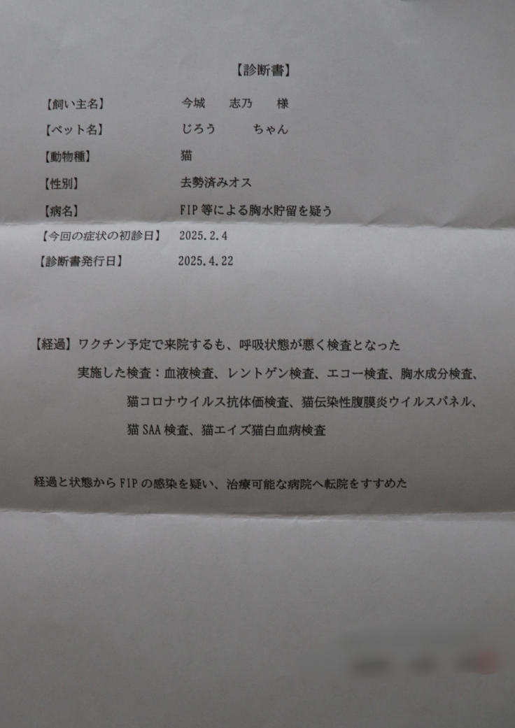 また、FIPにはドライタイプとウェットタイプが存在し、ティンクちゃんがドライタイプ、じろーくんとほっぷくんがウェットタイプと診断されています。