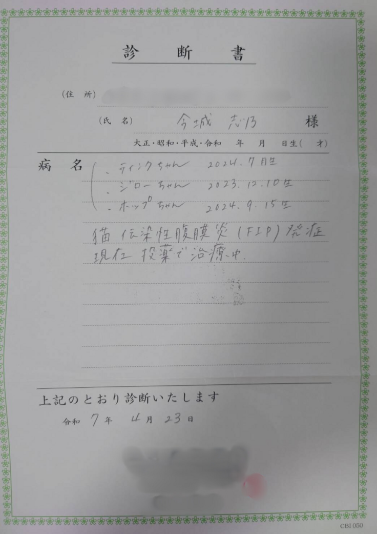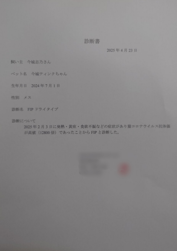 その後FIPドライタイプと診断され、84日間毎日の投薬が始まりました。