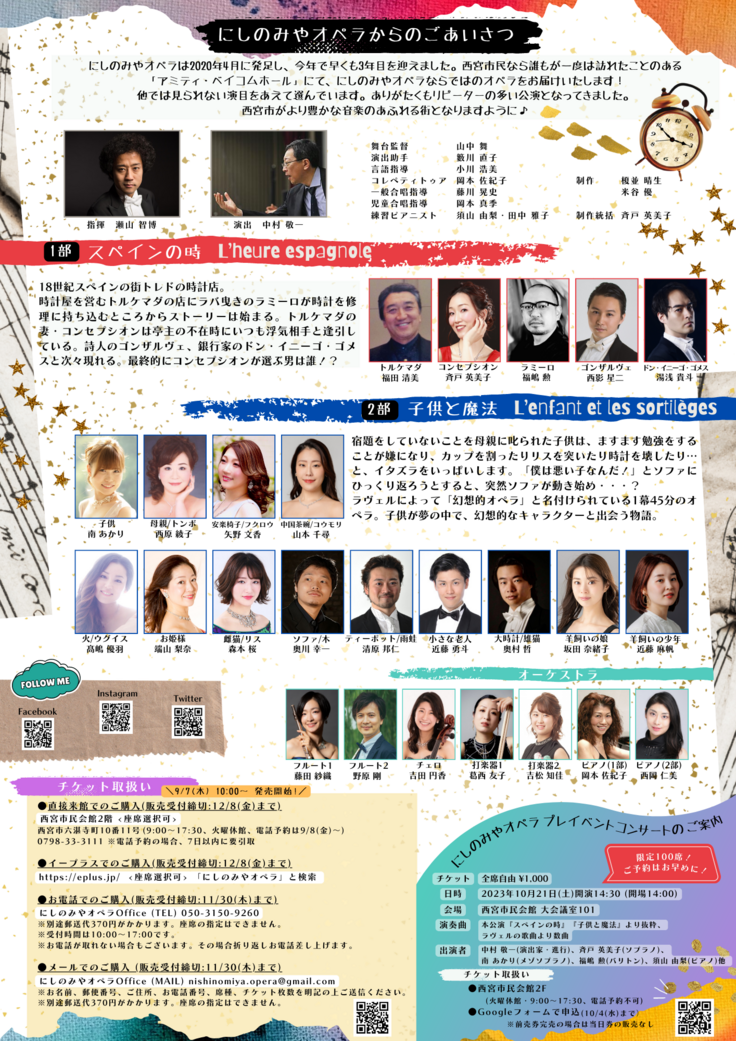 本年度はラヴェルのオペラ"スペインの時"と"子供と魔法"両作品の公演に向けて稽古を続けています。ラヴェルが生涯作曲したオペラはこの2作品のみですが、同時に上演する機会はなかなかありません。にしのみやオペラでは以前プーランクのオペラ"ティレジアスの乳房"も上演されており、取り上げる作品は他の団体と一線を画する独自の活動を続けられています。
