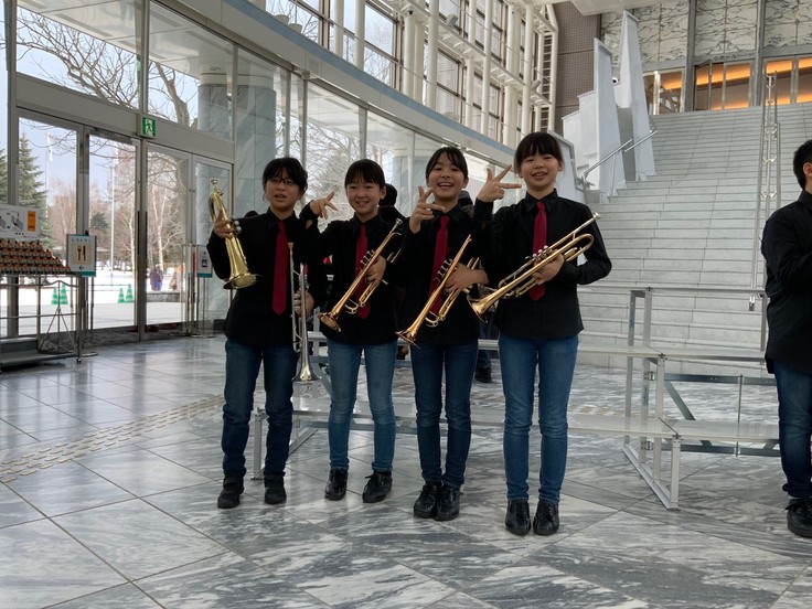 Kitaraホールは大変素晴らしいホールでした。360°客席で,明るい会場でした。ステージ裏もホテルのロビーのようなところでした。北海道の出場校もレベルが高く,少人数でもしっかりと音がひびいている学校がありました。本校と同様少人数の学校がありました。全校15名で2年生以上の14名が金管バンドメンバーとのこと。西内小と似ていると思いました。演奏も上手でした。