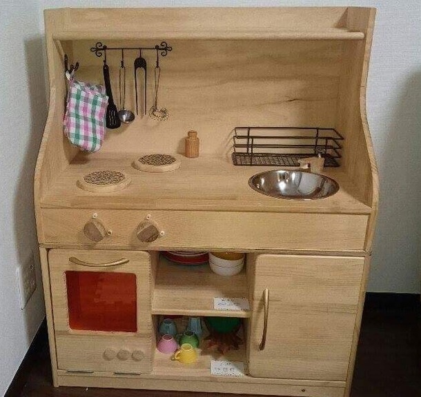 少し前ですが、おままごとが大好きな長男のために、木製キッチンを作りました。最初はコンロと流し台(上半分)を作ったのですが、思った以上に喜んでくれたため、下にオーブンと食器棚、冷蔵庫を追加しました。夜のうちに組み立てておき、朝起きてきた長男が完成品を見て「わぁ!」と言ってくれたことが、何よりも嬉しかったです(笑)次作は、最近乗り物に興味を持ち始めた次男のために、子ども用の運転席セットを考えています。