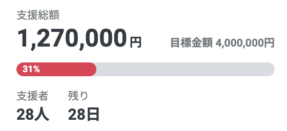 しかしながら、7月に入りクラウドファンディング期間も残り1ヶ月を切ったところでございますが、残り70%=380万円が必要な状況であり、正直を申しまして進捗は後がない状況となっています。