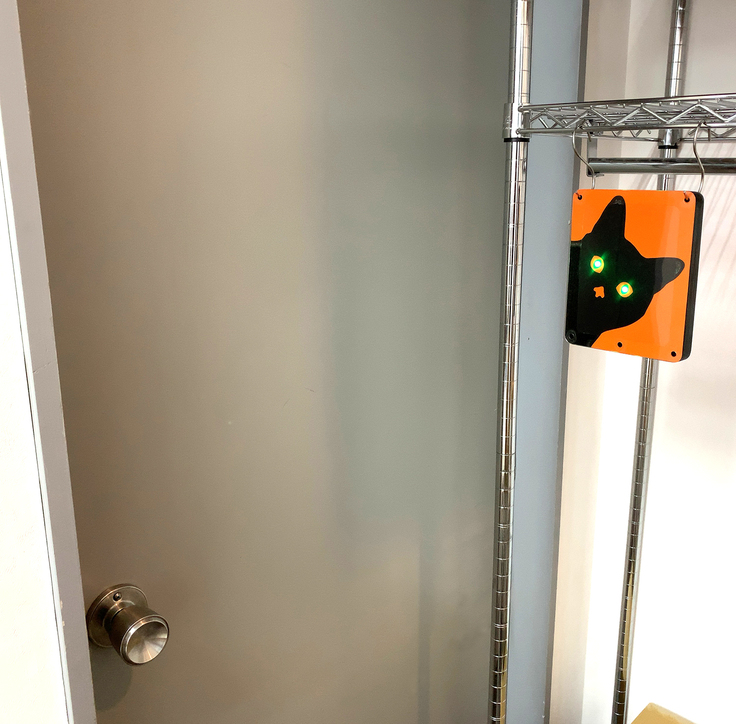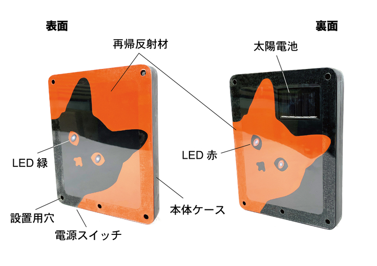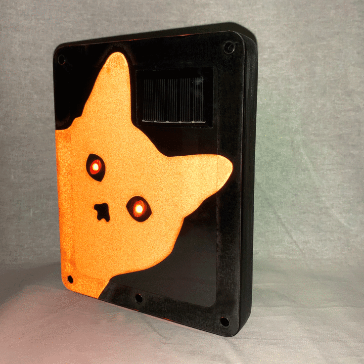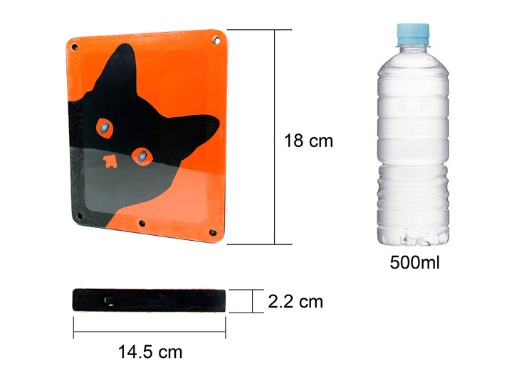 室内飼育の猫が外に飛び出さないように、玄関付近に設置して来訪者へ注意を促す目的でもご使用いただけます。(窓際の明るい場所に設置するか定期的に日光を当てて充電してください。)