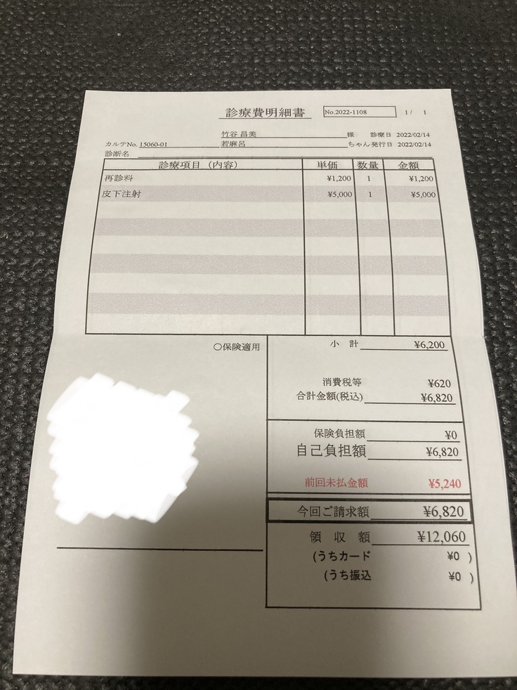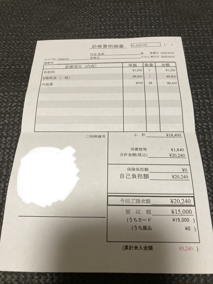 上記 診察明細記載の氏名は同居の母です。動物病院での名義を、母が若摩呂、娘(私)が乙女で分かれている為です。また、かかりつけの動物病院様からの希望で病院名は伏せさせていただいております。