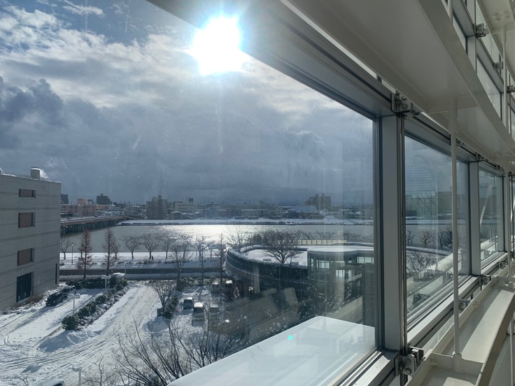 新潟市内はここ数日の雪でスタジオから見える景色も白く覆われています。Noismのメンバーは、毎日ここからの景色を眺めながら、春は桜を愛で、夏はむせるような緑を、秋は紅葉を、冬は今日のような美しい雪景色、そして厳しい寒さを感じています。