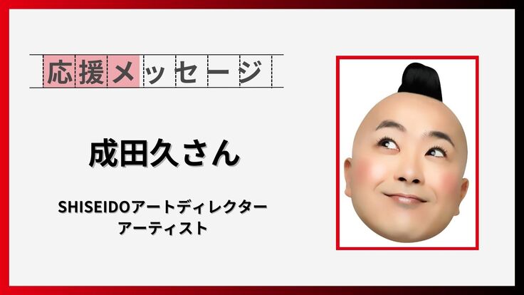 応援メッセージ、最後にご紹介するのはSHISEIDOアートディレクターで、アーティストの成田久さん。成田さんらしい、愛情溢れるメッセージをいただきました。どうぞご覧ください!