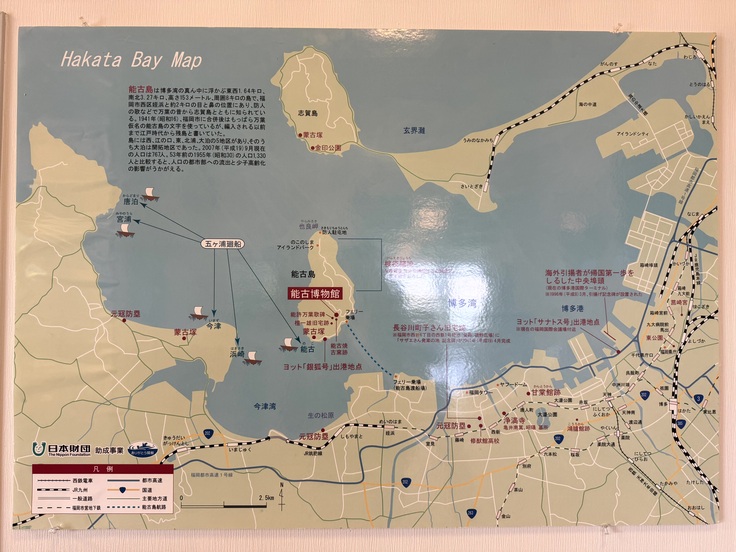 下の画像は博物館に設置されている博多湾をご紹介する地図パネルですが、福岡市中心部からも非常に近いことがご覧いただけるかと思います。