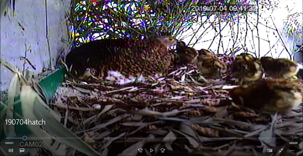 今はもう巣を離れ、7羽のヒナたちは母鳥のおなかの下に隠れたり、時々おなかの外に出てきたりして、エサをついばみ始めています。そして、あっちへこっちへとせわしなく動き回るので、母鳥はヒナたちを集めておなかの下に入れるのにてんてこ舞いしています。母鳥はとても大変そうです。