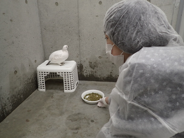 大町では大ベテランの宮野専門員の指導のもと、若いスタッフたちがチームワークでライチョウの飼育に取り組んでいます。
