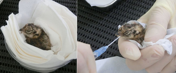 さらに、生まれたヒナは他の2羽のヒナに比べて体重が軽く、孵化後しばらくしても立ち上がることができず、未熟児の状態でした。このため、体をカップに入れて支えるようにしたり、数時間おきにブドウ糖などの栄養分を与えたりと必死の治療を行ないました。幸い、現時点では何とか元気な状態にまで回復してきています。