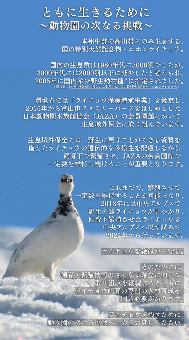 「残そうライチョウ! 動物園の次なる挑戦」では、今後も私たちがライチョウと共に生きていくために必要なことを進めていくプロジェクトとなっています。多くの方のご理解をいただき、ご支援いただけるよう、心からお願い申し上げます。