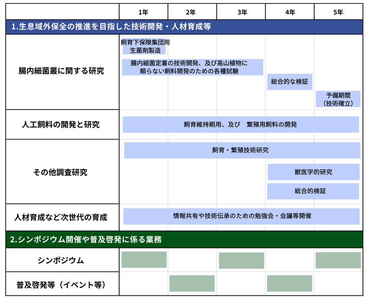 ・ライチョウ生息域外保全事業のさらなる推進とライチョウ飼育下保険集団の繁殖技術確立と個体数の維持を目指すにあたり、「生菌剤製造/ペレット製造/腸内細菌叢の研究/飼育下繁殖の調査研究/病理組織学的研究」への取り組みにかかる費用
