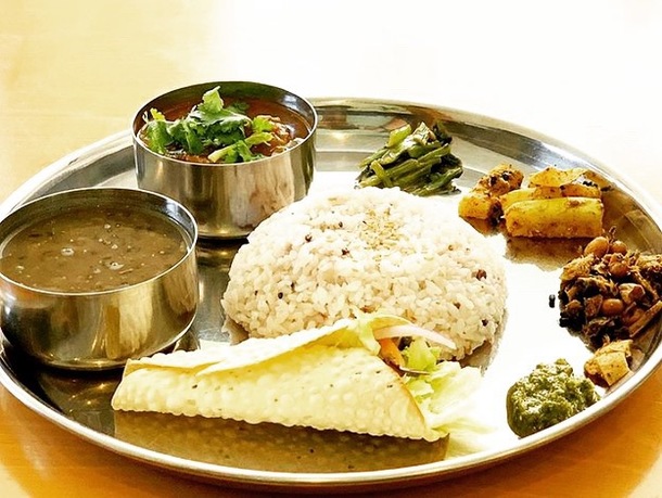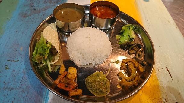 【dalbhat】 ダルバートは、ネパールの代表的な家庭料理で、ダルとバートの合成語で、それにカレー味の野菜などのおかず、漬物を加えたセットになった食事の事を言います。ネパールでは毎日食べられている、日本でいう定食にあたるものであります。