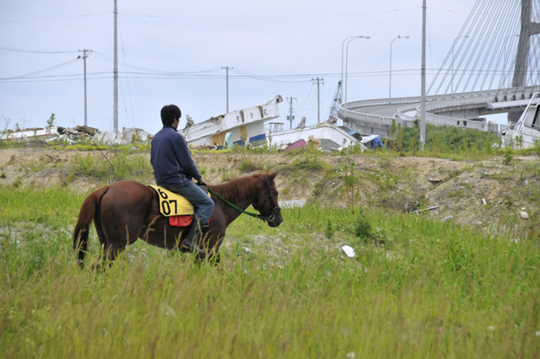(津波で被災した相馬漁港近辺で騎馬訓練中)