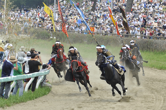 被災した年の夏は原発事故の影響で祭りは開催されませんでした。被災から1年後の2012年4月に小高地区が警戒区域解除になったことを機に、神事の中心神社である相馬小高神社などの走路表土の剥ぎ取りや芝草の深刈りによる除染作業をすることで放射線量の低減化。日本中央競馬会(JRA)の馬を借り、総勢400騎余の出陣で2012年7月28日から3日間の開催ができるようになりました。一千年の歴史を誇る相馬野馬追にかける地元の人たちの想いは夏の熱気とともに伝わってきました。厳かに悠々と歩む騎馬の姿は、集まった人々にとって復興へと向かう気持ちを奮い立たせたことでしょう。