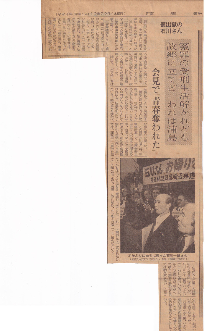 ・・・1994年12月22日の新聞に「21日夕方、石川さんが31年ぶりに自宅に戻った」という記事を見つけました(写真は私自身のスクラップ)。冤罪について何も知らなかった私は「良かった。これで石川さんは無罪になるんだ」と思ってしまい、支援活動から離れてしまいました。その後の私は音楽三昧の日々。夢かなってメジャーデビューは果たしましたが・・・。