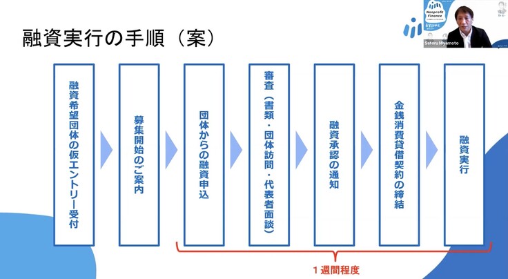 今回は、この事業の利用者であるNPOの皆さま向けの説明会レポートということで、融資実行の手順や基準と、仮エントリーの方法についてご紹介します。