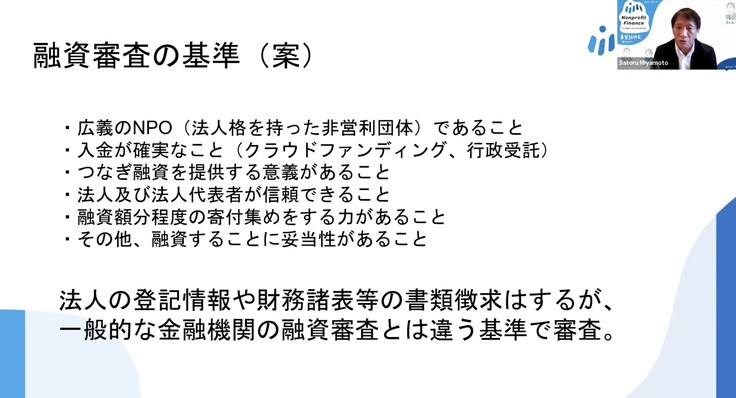 また、ゼロ金利での融資になるので、クラウドファンディングや行政の受託事業など入金が確実なことを基準として設定しています。そしてつなぎ融資をする意義があるか(そのプロジェクトの受益者にとって、早く金銭を提供することが有益であるか)ということも見ていきたいと考えています。