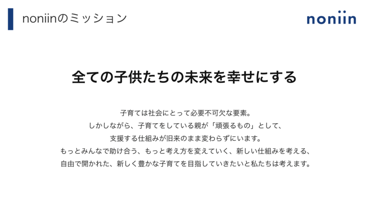 私たちは、「全ての子どもたちの未来を幸せにする」ことをミッションに、親となったパパ・ママの豊かな子育ての支援を目指していきたいと考えています。